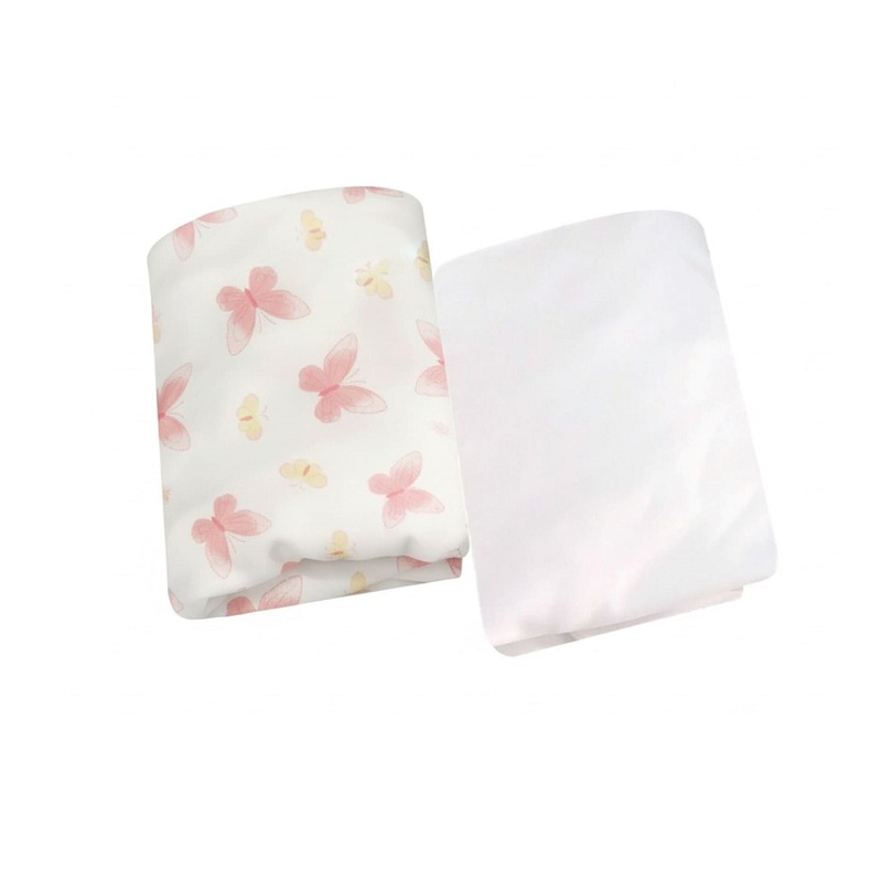 El set de Sabanas Bajeras para pack and play incluye 2 sábanas bajeras ajustables; 1 con estampado de mariposas; y 1 sábana en color blanco.