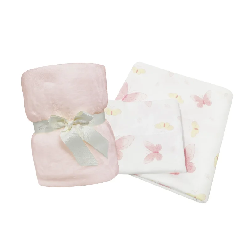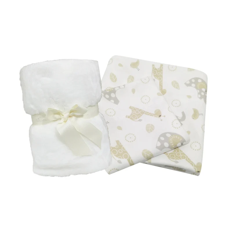 El set incluye una suave manta de felpa polar que complementa perfectamente las sábanas, ideal para mantener al bebé abrigado.